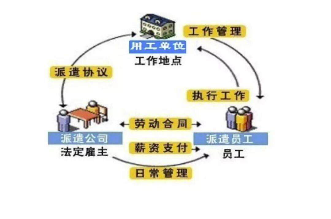 劳务派遣,是指派遣单位与劳动者签订劳动合同,并与用工单位签订劳务派遣协议,然后将劳动者派遣至用工单位工作,并由用人单位对劳动者进行日常管理的用工制度。其关系如下图所示: